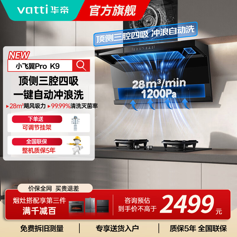 华帝(vatti)[小飞翼Pro K9]小飞碟28风量大吸力脱排油烟机 i111K9超薄平嵌7字型变频顶侧双吸三腔自动洗