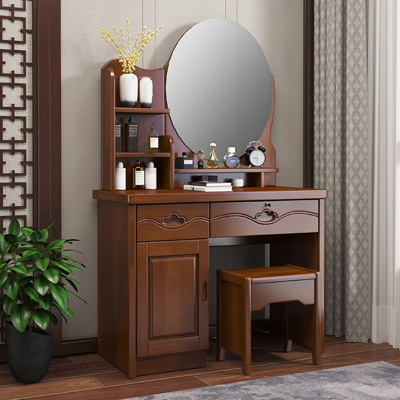 青木川 简约现代实木梳妆台主卧室卧室小户型家用收纳储物柜床头床尾农村带锁雕花化妆桌 胡桃色