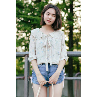 蜜妃儿夏装新款女宽松小清新五分袖碎花荷叶领雪纺衫上衣超仙