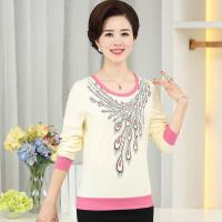 2017新款中老年女上衣长袖T恤衣服女春装妈妈装打底衫棉针织衫粉红色(底色淡黄色非纯白色)
