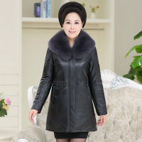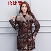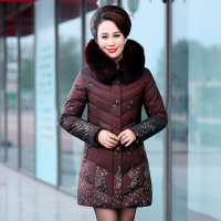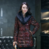 真皮羽绒服女中长款新款妈妈装狐狸毛领印花皮羽绒皮衣中老年