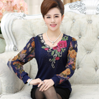 中年时尚妈妈装秋装V领镶钻打底衫T恤40岁50中老年女装长袖针织衫