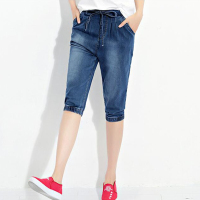 普美思 2017秋季新品新款松紧腰宽松大码七分裤女韩版百搭系带学生牛仔哈伦裤休闲裤女小脚