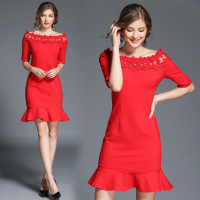 欧洲站女装2017早秋新款修身一字肩荷叶边礼服包臀显瘦连衣裙红色