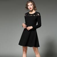 赫本小黑裙2017早秋新款欧美女装镂空花朵圆领长袖打底连衣裙黑色