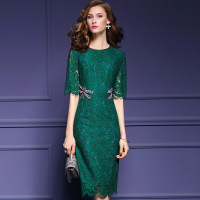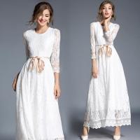 欧洲站2017早秋新款女装蕾丝连衣裙高端镂空系带大摆礼服裙白色