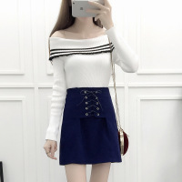 珂依舍2017秋装新款秋款女装时尚套装一字肩两穿针织衫系带高腰A字短裙两件套
