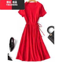 YIBUSHENG新款棉绸连衣裙女季纯色V领短袖显廋中长款人造棉外穿绵绸裙子