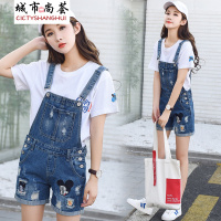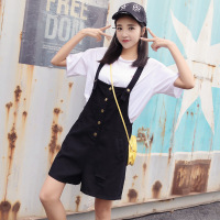 新款无弾贴布绣花宽松破洞学生装牛仔背带短裤女