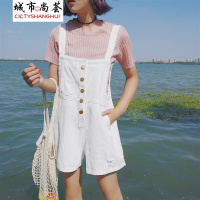 珂依舍2018春夏装新款韩版学院风白色牛仔背带短裤排扣显瘦破洞宽松吊带裤
