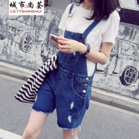 ~新款显瘦白色背带裤女连体裤 磨破牛仔短裤阔腿裤