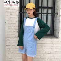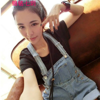 锦铭七玥大码女装背带裤 吊带牛仔裤高腰牛仔短裤2017新款学院牛仔裤