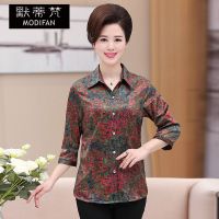 默蒂梵2017夏装新款中年女式真丝T恤衫方领印花妈妈装休闲七分袖开衫