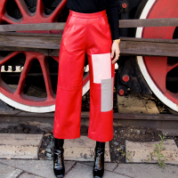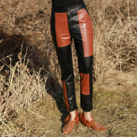 冬新款真皮皮裤女中腰九分裤拼色时尚阔腿裤洋气绵羊皮裤气质