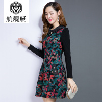 2017秋装新款韩版长袖圆领印花拼接气质修身中长款连衣裙女
