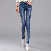 普美思 磨破牛仔裤女2017秋冬女装新款韩版中腰潮流显瘦百搭弹力小脚裤铅笔裤长裤女