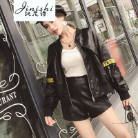 纪尼诗(Jinishi)女装2018秋冬新款学院风拉条撞色重工刺绣短款洗水PU外套女黑色