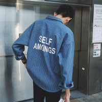 莞馨(wanxin)新款港仔情侣秋装文艺宽松长袖衬衣牛仔布小清新印花水洗条纹潮男衬衫