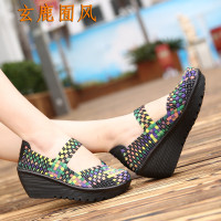 玄鹿囿风夏季新款松紧带手工编织鞋女休闲布鞋松糕厚底摇摇鞋坡跟夏季女鞋
