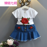 锦铭七玥2017夏季新款童套装 女童立体花朵竹节棉T恤+儿童牛仔包裙两件套
