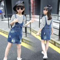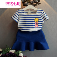 锦铭七玥夏季新款童套装 女童条纹笑脸T恤+儿童牛仔包裙两件套 夏款童套装
