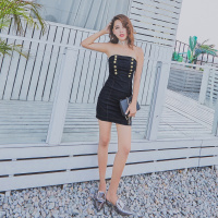 2017夏新款欧美性感一字肩双排扣抹胸牛仔包臀裙女连衣裙