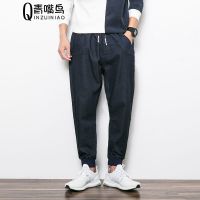 尊首新款2017新款日系口袋撞色水洗抽绳收口休闲牛仔裤男青年宽松哈伦裤潮蓝色