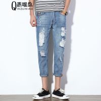尊首新款20172017春夏季韩版破洞牛仔裤男九分修身小脚裤中学生潮流乞丐9分裤浅蓝色