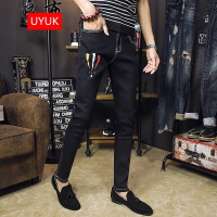 UYUK秋冬新款泼墨牛仔裤男修身小脚学生韩版潮流个性弹力百搭裤子黑色