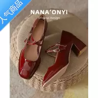 SUNTEK酒红色玛丽珍女鞋2023年新款法式高跟鞋设计感小众粗跟方头单鞋女