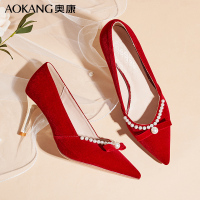 SUNTEK春夏季新款尖头单鞋高跟鞋中跟浅口漆皮细跟女鞋工作鞋红色婚鞋女