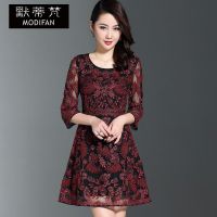 默蒂梵2017春夏新款大码妈妈中年网纱绣花刺绣婚礼婚宴收腰中袖连衣裙