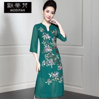默蒂梵2017春装新款女绣花七分袖修身显瘦真丝连衣裙中长款