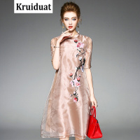 YIBUSHENG中年妈妈装棉绸绣花连衣裙女装短袖中长款宽松大码显瘦大摆裙子