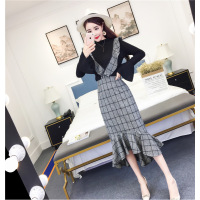薇侣2017新品初秋新款百搭喇叭袖打底衫+荷叶边背带格子连衣裙
