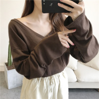珂依舍2017秋装新款慵懒の深咖色宽松前后大v领显瘦长袖T恤女