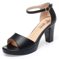 SUNTEK粗跟凉鞋2023夏季水钻凉鞋气质软皮高跟鞋一字扣鱼嘴女鞋