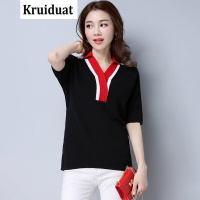 Kruidvat 2017春 女士针织衫 翻领短袖撞色拼接针织T恤衫YS 黑色 均码