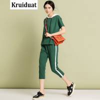 奈琴尔茧法2017新款针织套装简约连帽短袖上衣+修身松紧腰九分裤两件套YQ绿色