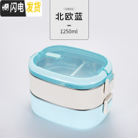 三维工匠304不锈钢分格饭盒多层学生男女便当盒日式韩国带盖上班族1人餐盒 北欧蓝2层[含餐具]+保温袋