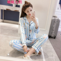 锦铭七玥2018春秋季睡衣女生条纹仿真丝长袖薄款居服套装夏