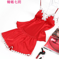 锦铭七玥女士夏季带胸垫睡裙吊带短裤女生睡衣套装 仿真丝刺绣蕾丝居服