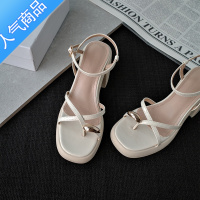 SUNTEK羊皮版~金属夹趾凉鞋仙女风白色粗跟法式温柔配裙子一字带高跟鞋