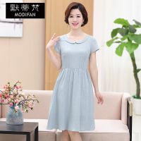 默蒂梵2017夏季新款连衣裙提花娃娃领棉麻裙修身高腰中长款中年妈妈女装