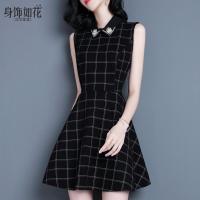 娃娃领连衣裙春秋新款淑女修身气质打底无袖格子背心裙小黑裙黑色