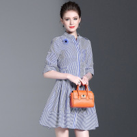 新款娃娃领蓝白条纹收腰A字裙春季新款五分袖显瘦连衣裙