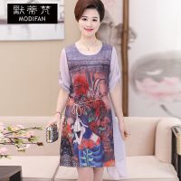 默蒂梵中年妈妈装时尚印花连衣裙夏季中袖宽松大码女装蚕丝雪纺裙