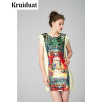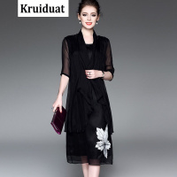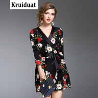 Kruidvat2017新款欧美女装印花中长款假两件放真丝雪纺连衣裙女LSN