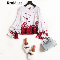 Kruidvat2017春季女装三层花边袖玫瑰印花真丝上衣B075图片色