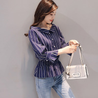 莞馨2017秋季新款韩版女装休闲修身显瘦百搭条纹七分袖衬衫衬衣女上衣